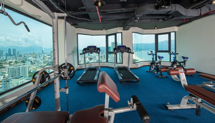 Phòng gym trên cao với tầm nhìn hướng núi và biển