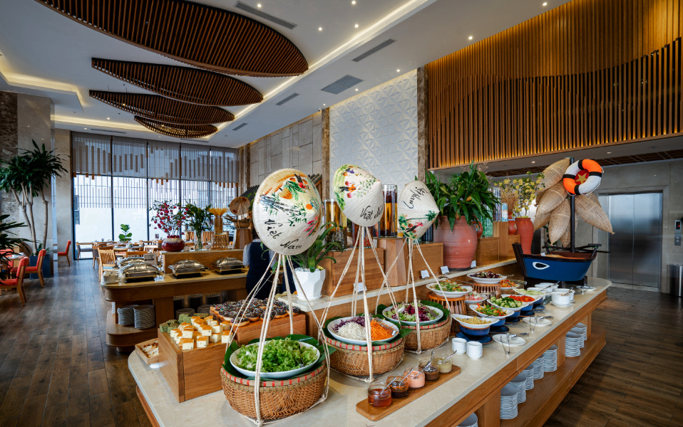 Nhà hàng với quầy buffet đa sắc màu, kết hợp nét văn hóa Việt